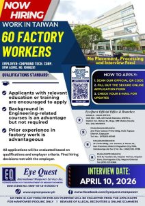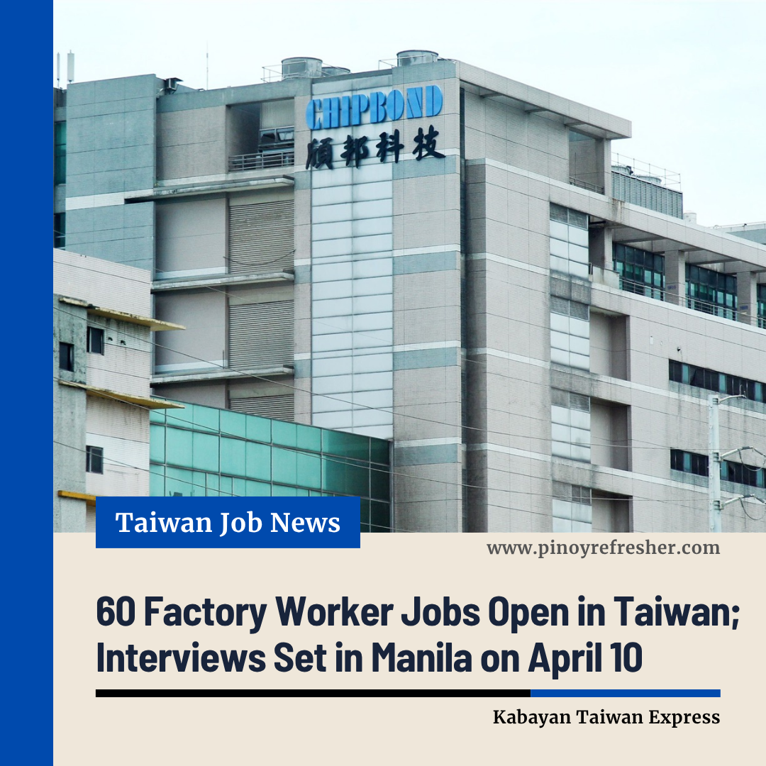 The job openings are for 60 factory worker positions under Chipbond Technology Corporation, a well-known company in Taiwan’s semiconductor industry. Qualified applicants will undergo an in-person interview scheduled on April 10, 2026, at the agency’s main office in Malate, Manila.