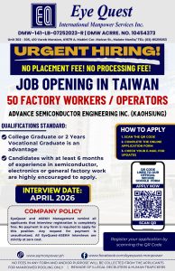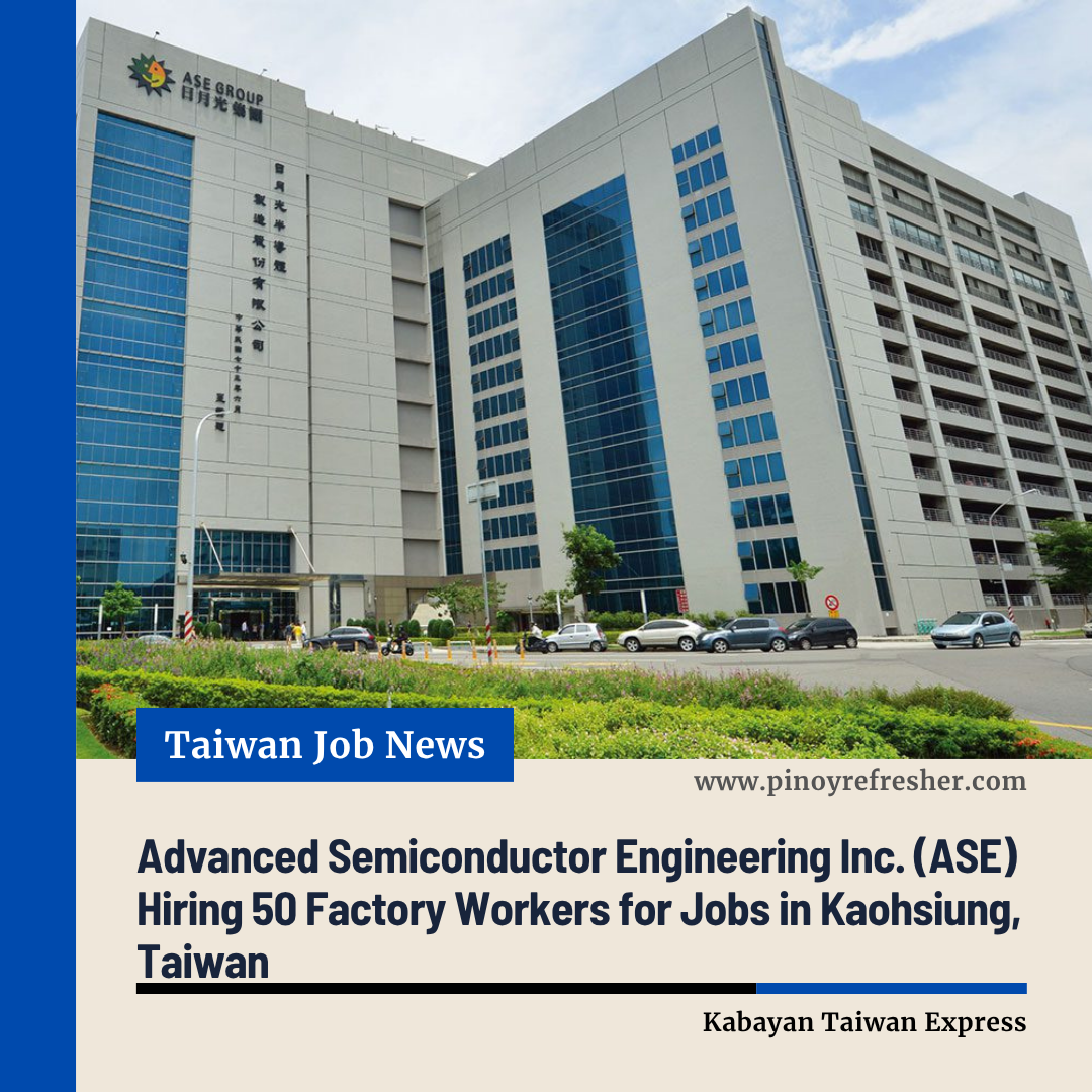 Kaohsiung, Taiwan — Filipino job seekers looking for opportunities in the semiconductor industry can now apply as Advanced Semiconductor Engineering Inc. (ASE) opens 50 positions for Factory Workers/Operators in Kaohsiung, Taiwan.