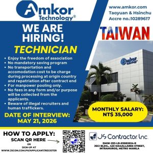 Great news for Filipino skilled workers! Amkor Technology, a globally recognized leader in semiconductor packaging and testing services, is now hiring skilled technicians for its operations in Taiwan. This is a valuable opportunity to work with a reputable international company and gain solid experience in the semiconductor industry 🌏🔧.