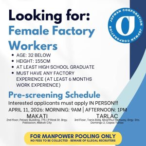 As part of the recruitment process, pre-screening activities will be conducted in two key locations—Makati City and Capas, Tarlac—providing accessible options for applicants in Luzon.