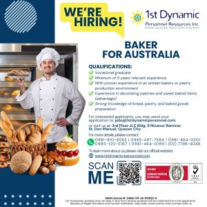 Take your baking career to Australia and join the growing community of skilled Filipino talents working abroad. Apply now with 1st Dynamic Personnel Resources Inc. and start your international journey!