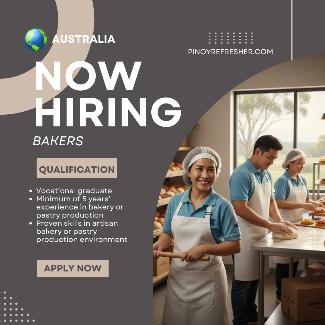 Take your baking career to Australia and join the growing community of skilled Filipino talents working abroad. Apply now with 1st Dynamic Personnel Resources Inc. and start your international journey!