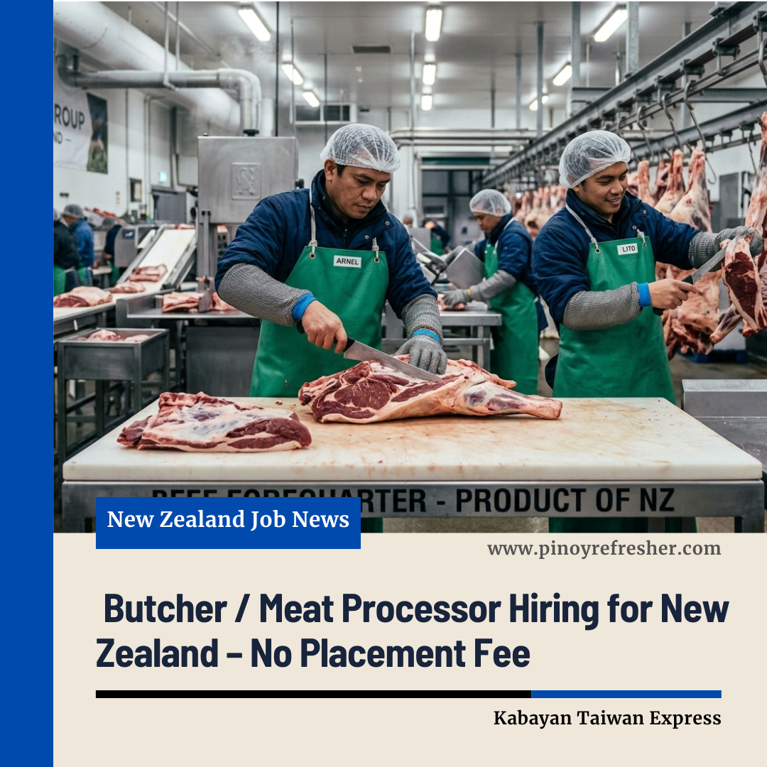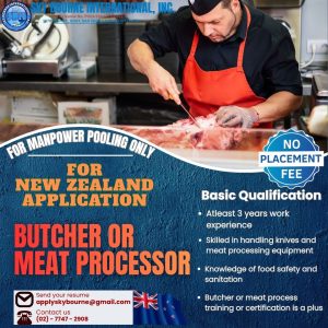 Great news for skilled meat industry workers! Sky Bourne International, Inc. is now accepting applications for Butcher or Meat Processor positions bound for New Zealand. This opportunity is open for manpower pooling only and comes with a major advantage—NO placement fee, NO application fee, and NO interview fee 🚫💰.