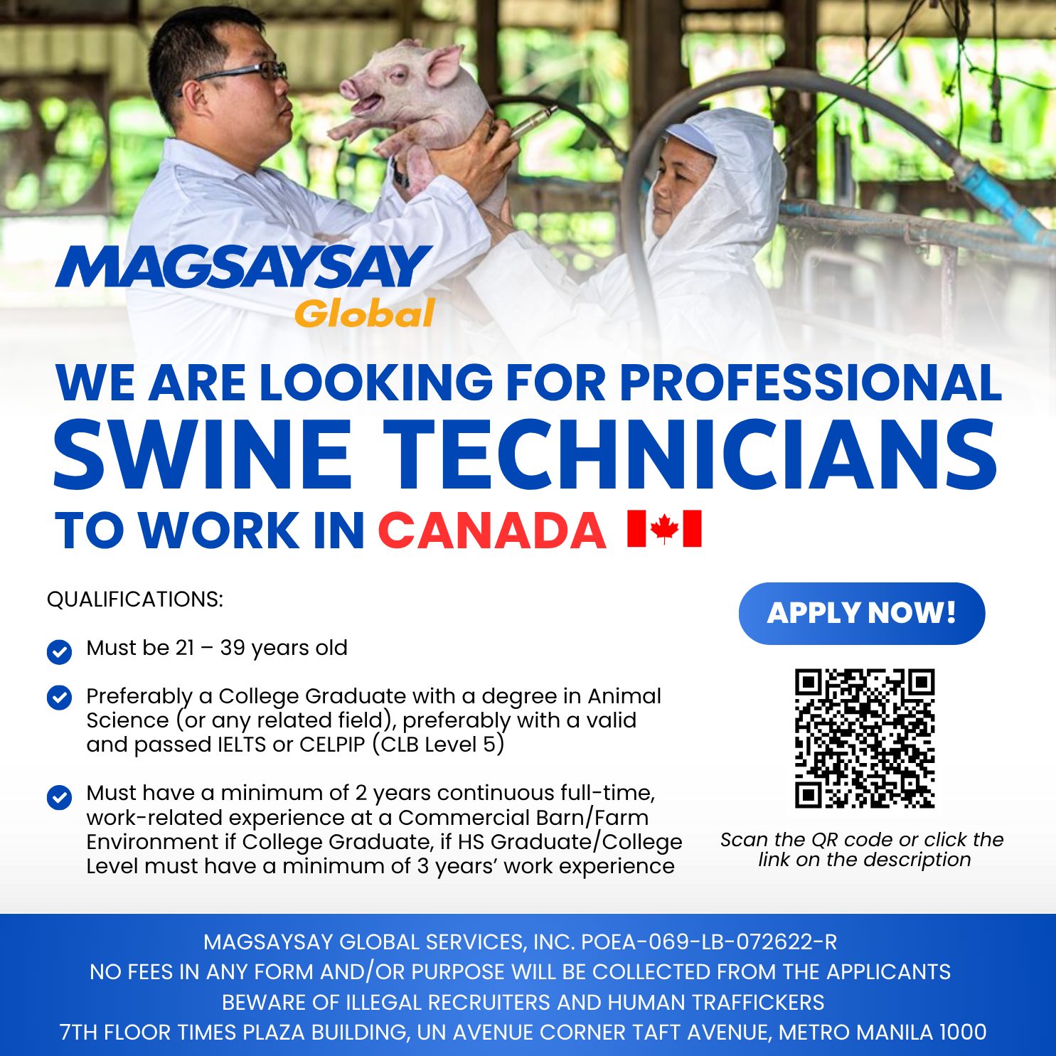Manila, Philippines — Magsaysay Global Services, Inc. is officially launching its recruitment program for Swine Technicians to work in Canada, offering Filipino professionals the chance to build rewarding careers in the country’s expanding agricultural sector.