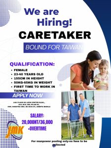 A new overseas employment opportunity is now available as recruitment opens for Caretakers bound for Taiwan. Interested applicants are encouraged to visit the agency office for initial screening and evaluation.