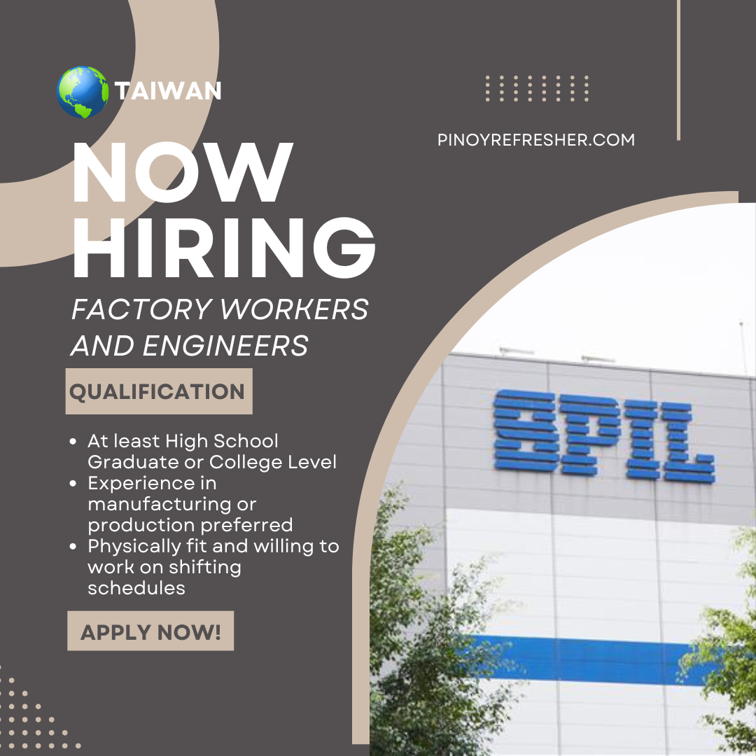 🇹🇼 TAIWAN NOW HIRING: FACTORY WORKERS & ENGINEERS📅 Job Order Valid Until: October 17, 2025 Available Positions 🔹 FACTORY WORKERS Principal: BKD Biotechnology Food Co.
