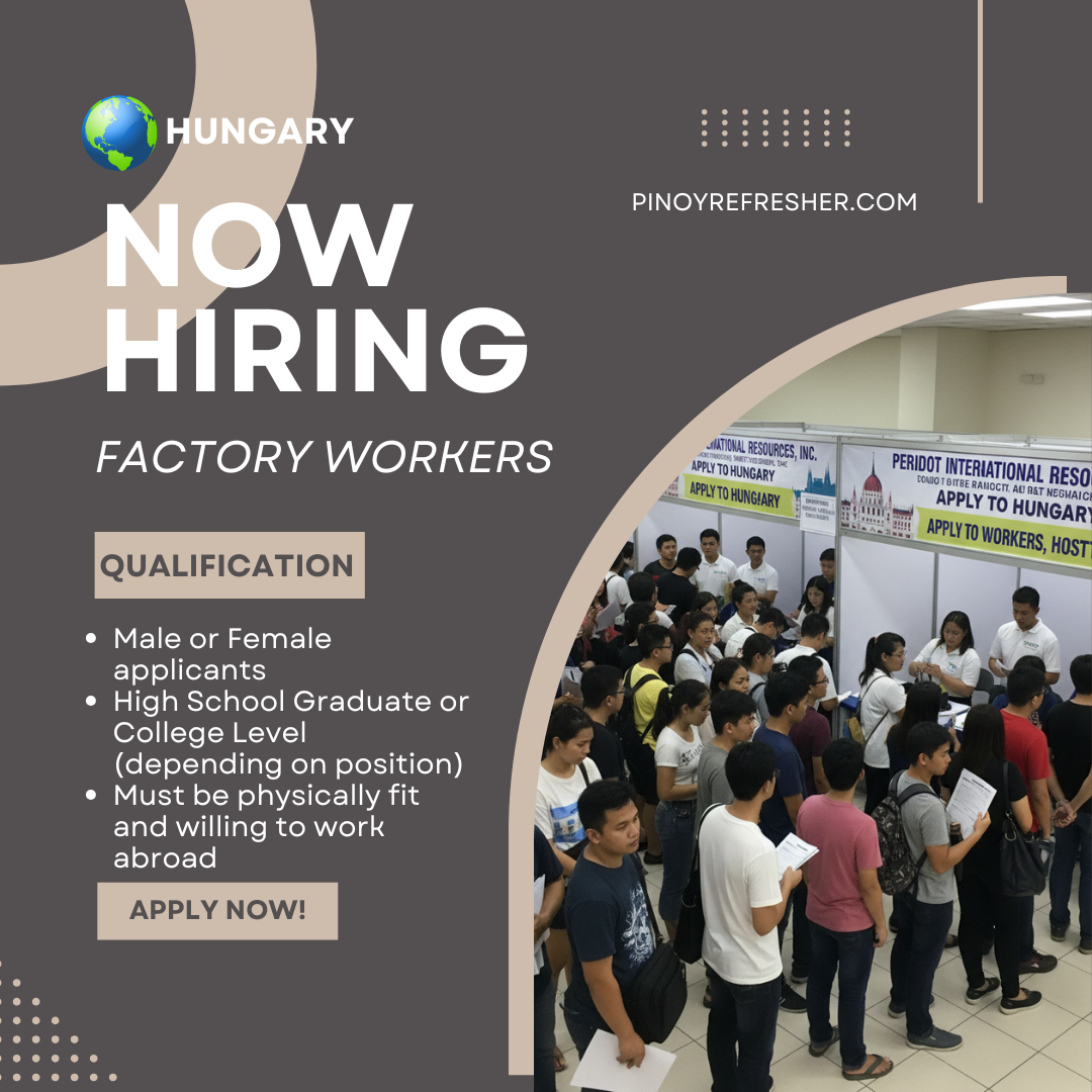 ๐ญ๐บ NOW HIRING: JOB OPPORTUNITIES IN HUNGARY! Agency: Peridot International Resources, Inc.POEA Licensed Recruitment Agency Looking for an opportunity to work in Europe? Start your