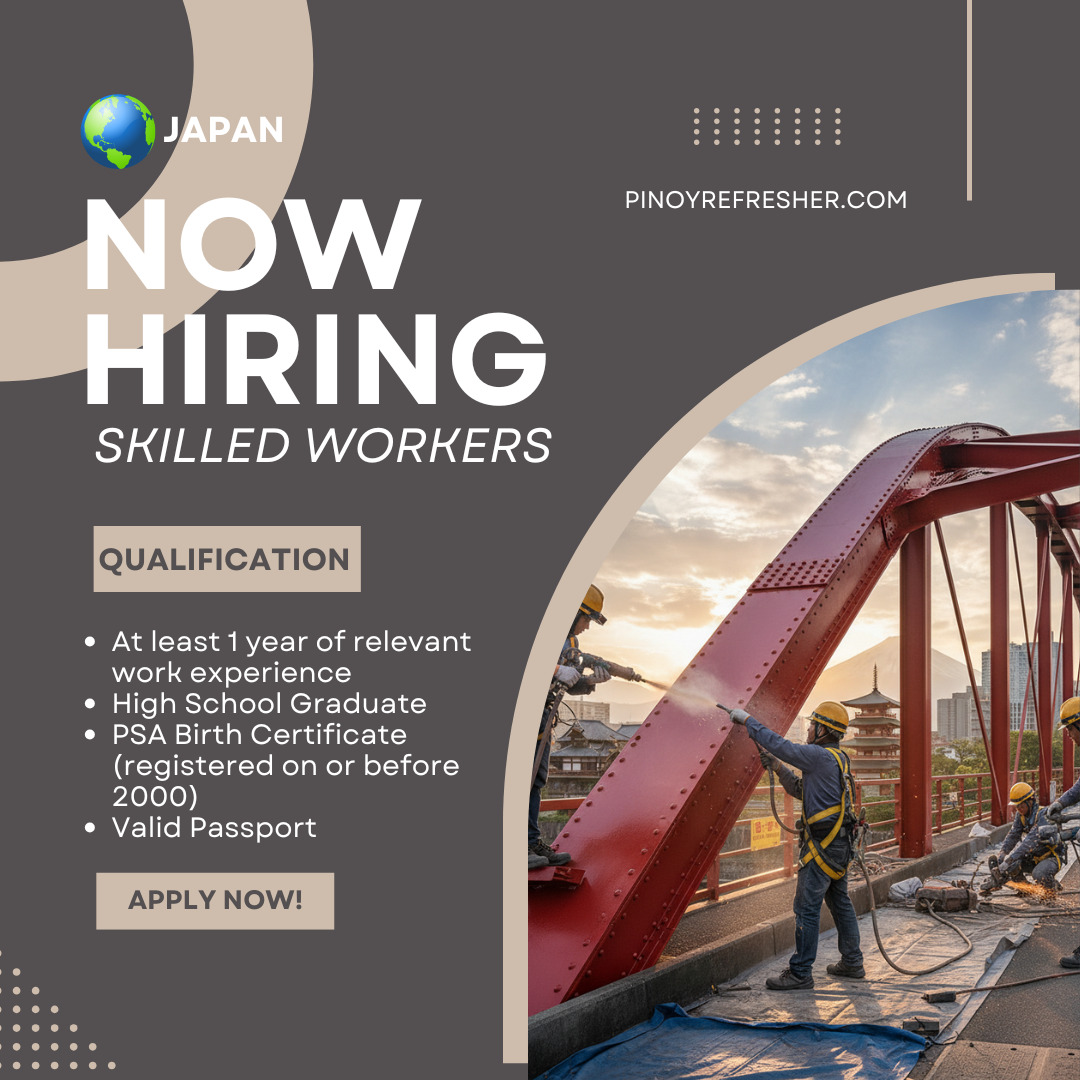 🇵🇭 Hiring Pinoy Workers for Japan Available Job Matches: Blaster Building Painter Steel Bridge Painting Spray Painting Power Tooling Qualifications: At least 1 year of