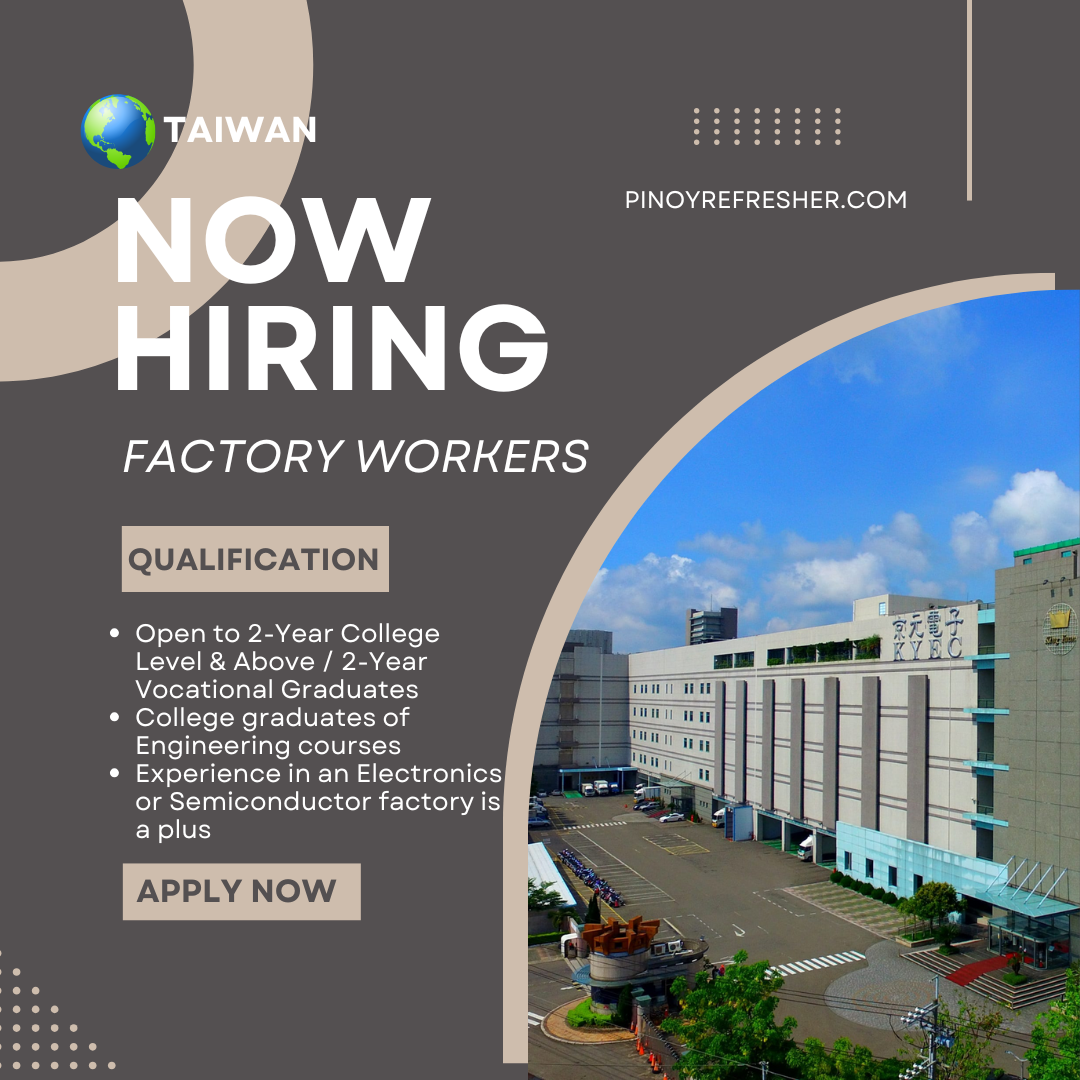 🌏 Continuous Hiring! Male & Female Factory Workers – Taiwan 🇹🇼 Are you ready for an overseas opportunity? We are hiring factory workers for various