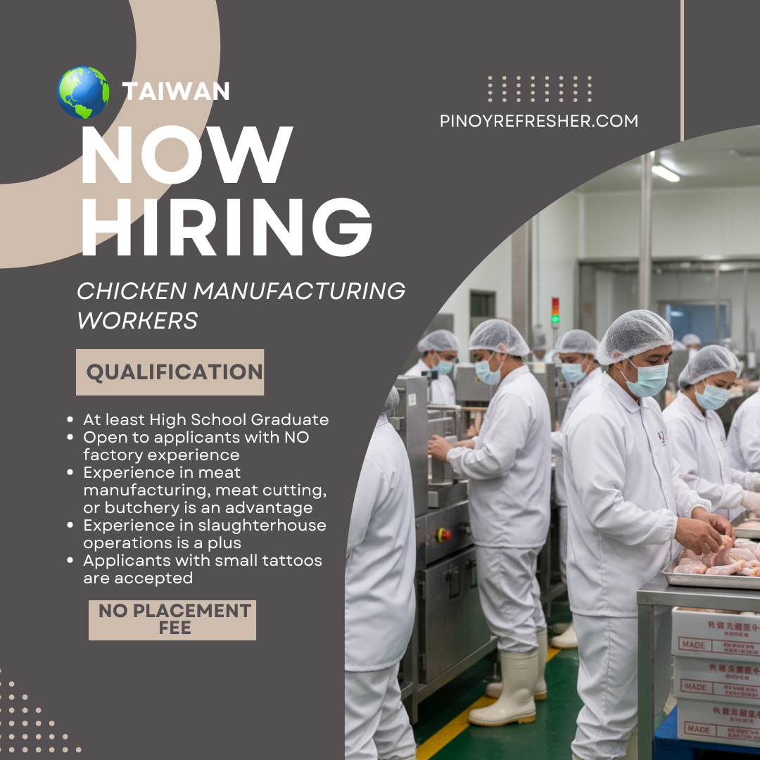 URGENT HIRING – CHICKEN MANUFACTURING WORKERS FOR TAIWAN We are urgently hiring Male and Female Factory Workers for a Chicken Manufacturing Company in Taiwan.This opportunity