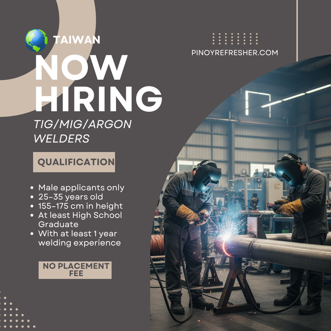 Job Opportunity: TIG / GTAW / MIG Welder for Taiwan (Urgent Hiring | Manpower Pooling Only) JS Contractor, Inc. is urgently hiring qualified male welders