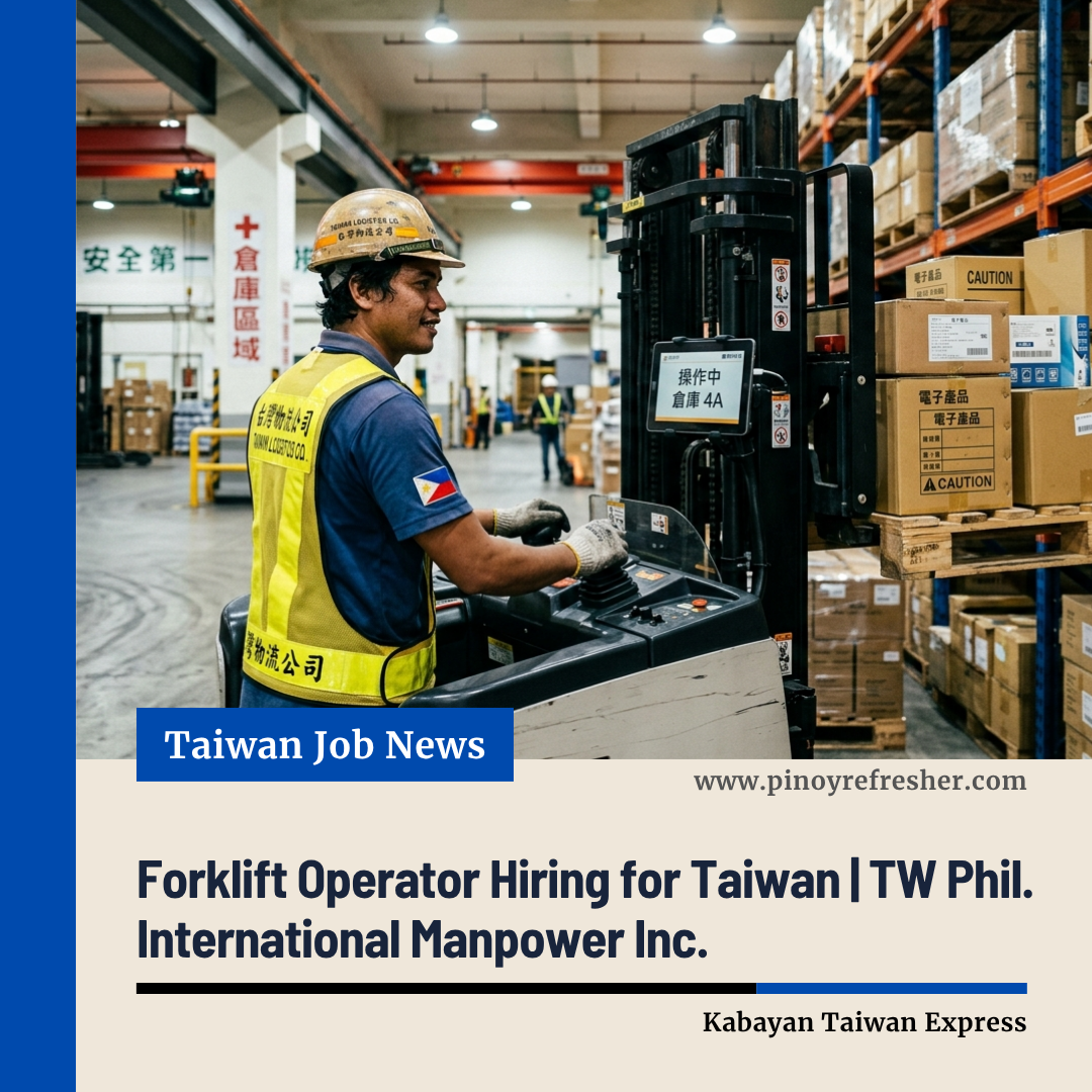 Forklift Operators Bound for Taiwan Needed; TW Phil. International Manpower Inc. Opens Hiring Filipino job seekers with warehouse experience now have a new opportunity to