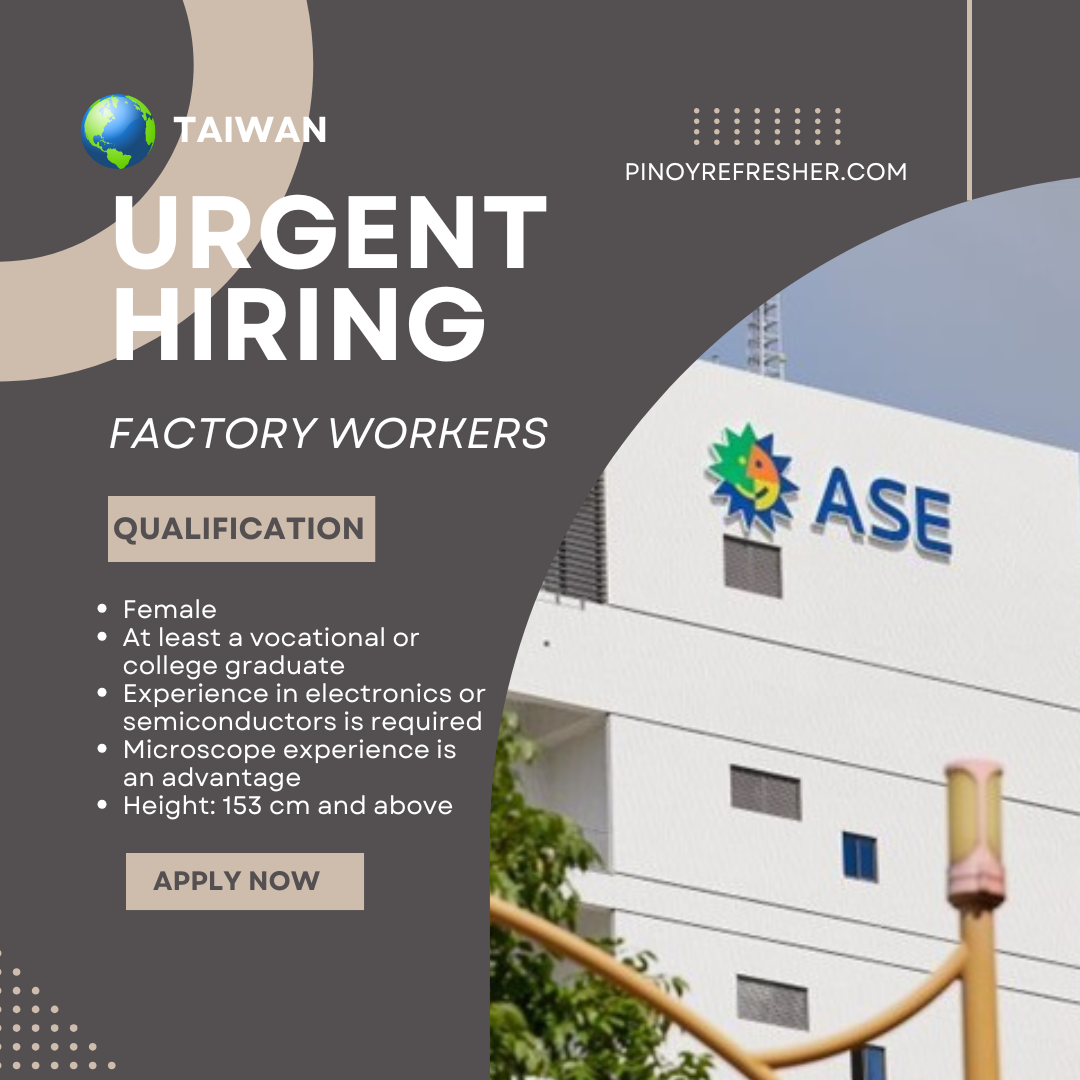 π¨ URGENT HIRING: Factory Workers Bound for Taiwan β APPLY NOW! No Experience Required | No Placement Fee Looking for a job abroad? Here’s your