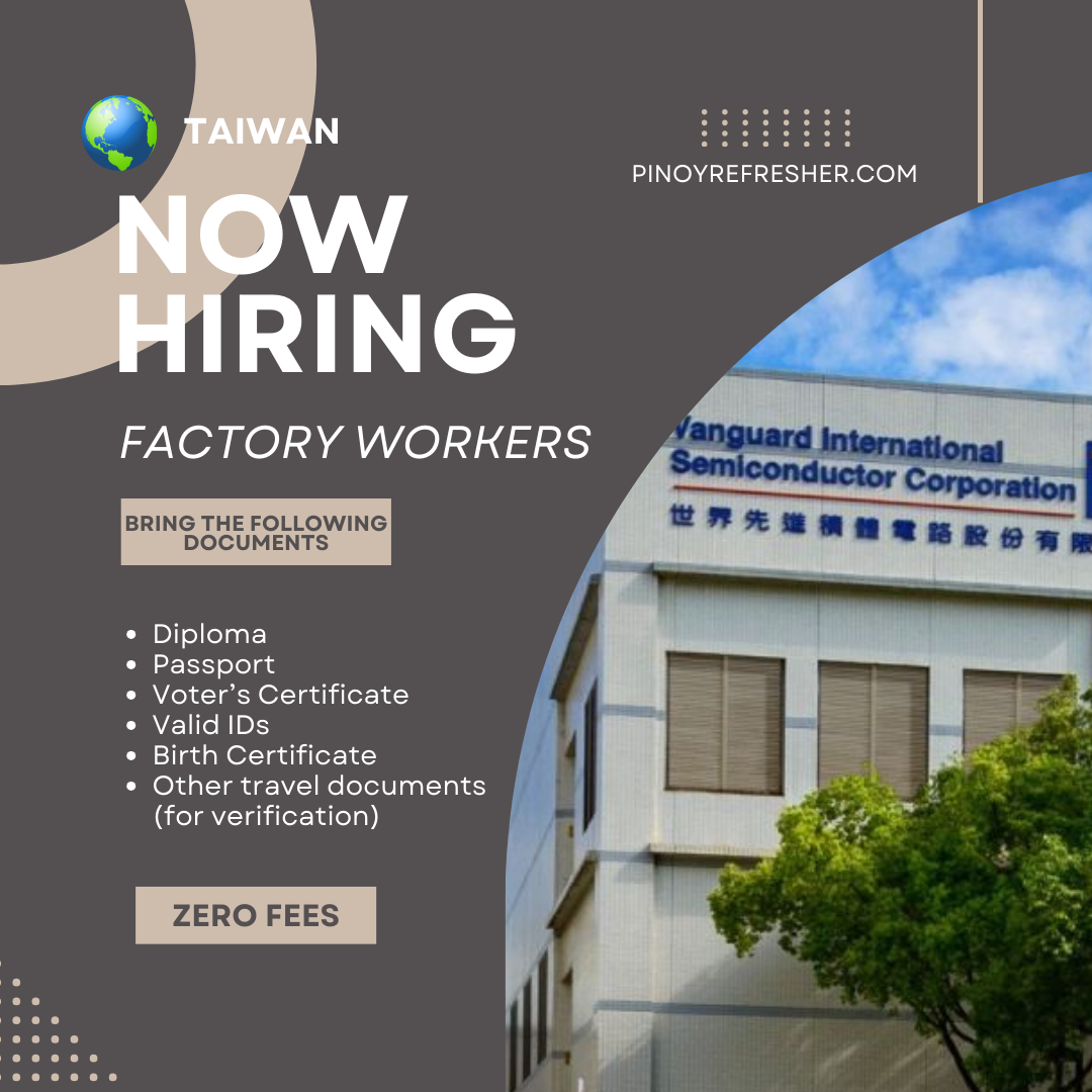 HIRING FACTORY WORKERS Location: Taiwan Salary: NT$28,590 Qualifications – Male/Female – 20 to 34 years old – At least High School Qualified applicants are invited