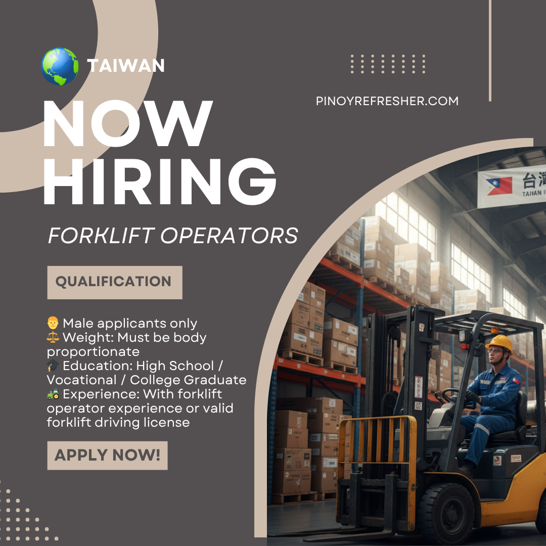 📢 NOW HIRING: FORKLIFT OPERATORS FOR TAIWAN 🇹🇼 Looking for an opportunity to work abroad? Here’s your chance! City Employment Center, Inc. is urgently hiring