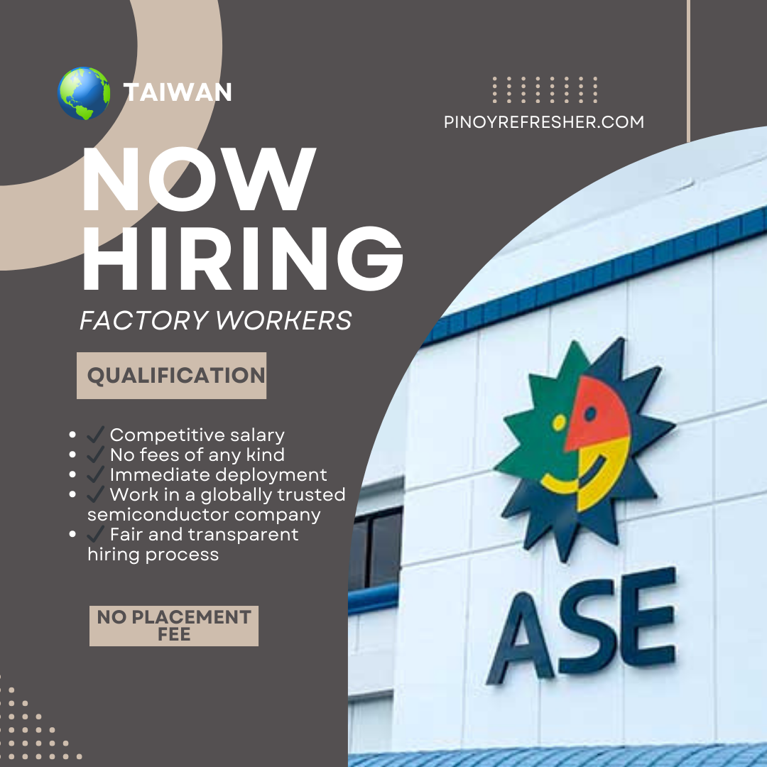 Hiring Factory Worker Location: Zhongli, Taoyuan Taiwan Company: ASE Chungli Branch Salary: NT:28,590 NO PLACEMENT FEE NO PROCESSING FEE About the company ASE (Advanced Semiconductor