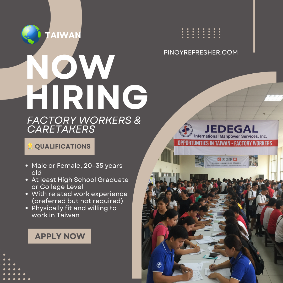🇹🇼 Urgent Hiring: Factory Workers and Skilled Personnel in Taiwan! ✨ About the Agency JEDEGAL International Manpower Services, Inc. is one of the Philippines’ most