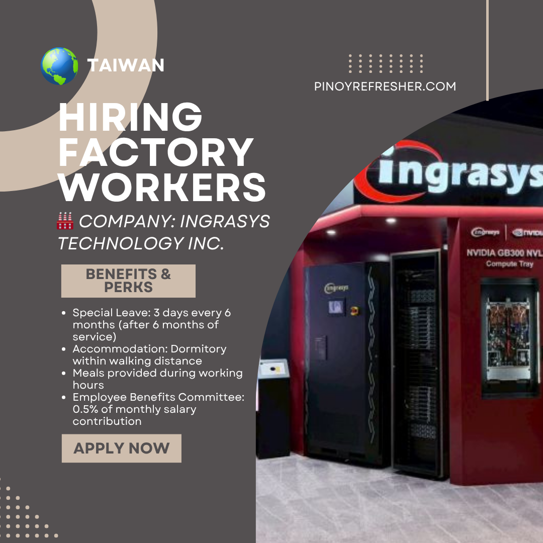 🌏 CONTINUOUS HIRING! FACTORY WORKERS FOR TAIWAN 🇹🇼 Company Name: INGRASYS TECHNOLOGY INC. (DMW-Reg-10401219)📅 Employer’s Interview Date: November 27 & 28, 2025💼 RBA / ZERO