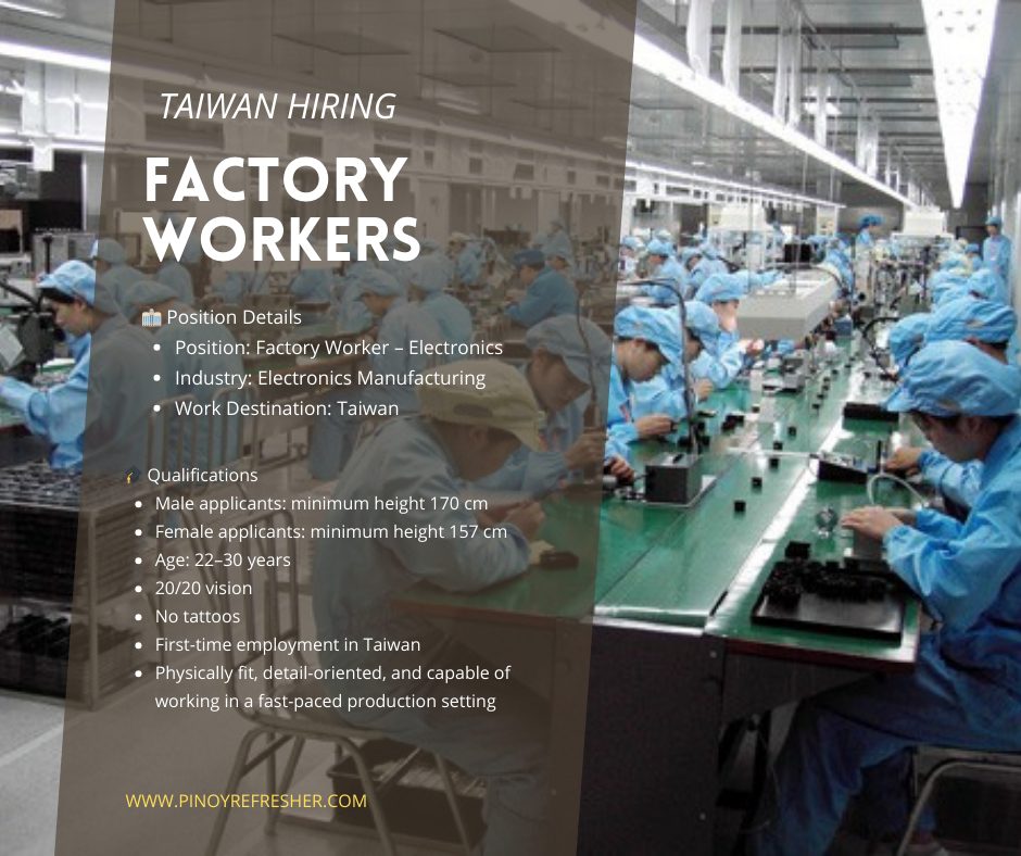 ๐ Hiring: Factory Workers (Electronics) โ Taiwan A DMW-licensed recruitment agency is now conducting manpower pooling for Factory Workers โ Electronics for deployment to Taiwan.