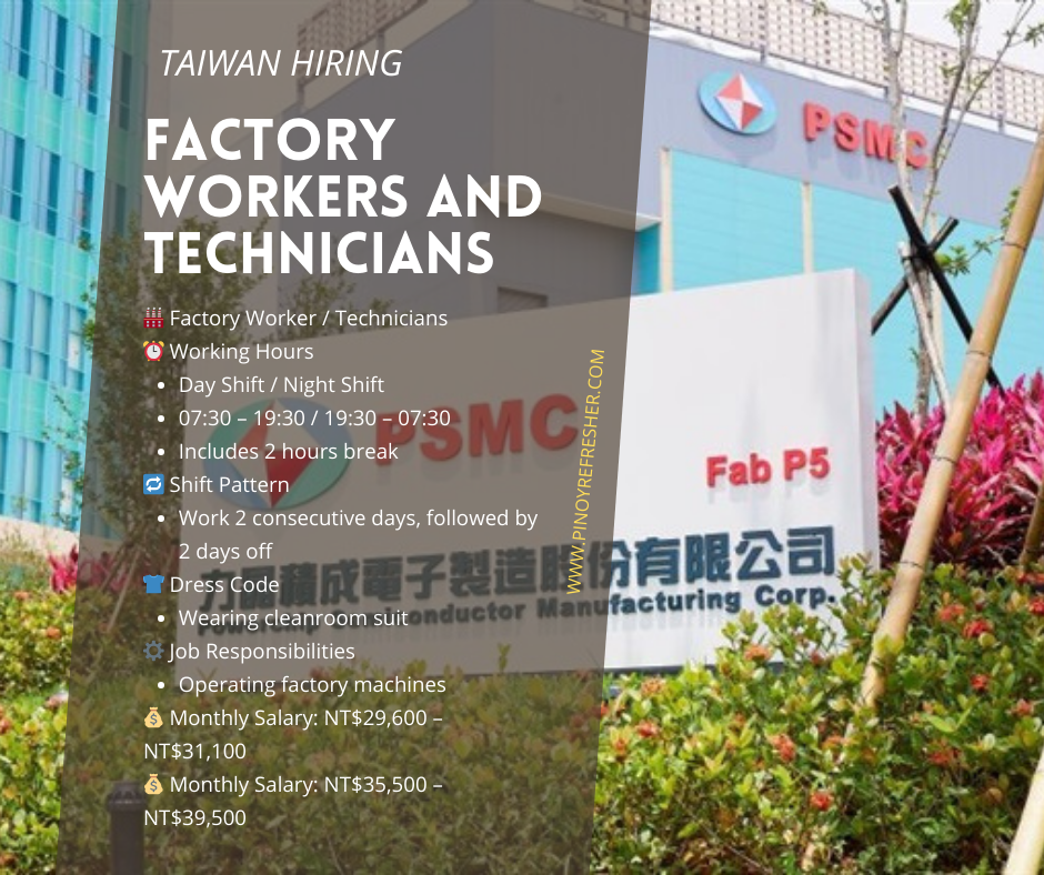 🇹🇼 Taiwan Job Opportunity 🏭 Factory Worker & Technician Needed Good news for Filipino workers looking for opportunities abroad! Powerchip Semiconductor Manufacturing Corporation (PSMC) is