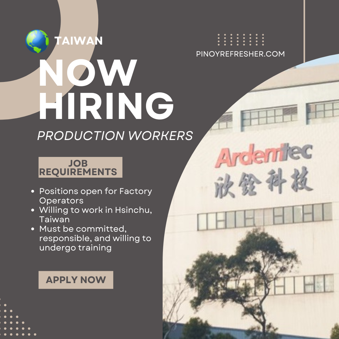 Hiring Factory Workers Location: Taiwan Salary: NT$27,470 Qualification Male 21 yrs old to 35 yrs old At least Vocational Graduate/ 4 Year College Graduate Height