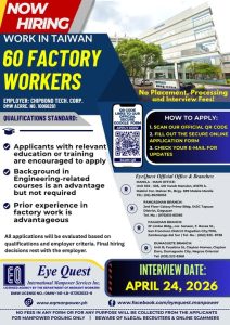Manila, Philippines β€” April 2026 β€” A new overseas job opportunity has opened for Filipino workers as Chipbond Technology Corporation is set to hire 60 factory workers for deployment in Taiwan πŸ‡ΉπŸ‡Ό.