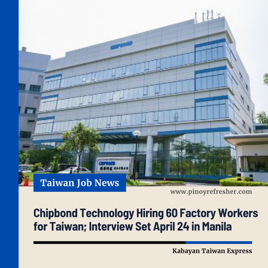 Manila, Philippines β€” April 2026 β€” A new overseas job opportunity has opened for Filipino workers as Chipbond Technology Corporation is set to hire 60 factory workers for deployment in Taiwan πŸ‡ΉπŸ‡Ό.