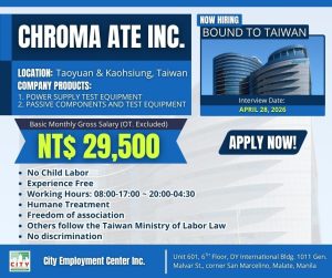 A new opportunity is now available for Filipino job seekers as Chroma ATE Inc. announces its latest recruitment drive for factory workers bound for Taiwan 🇹🇼. The hiring is being facilitated by City Employment Center Inc., offering competitive pay and worker-friendly conditions.