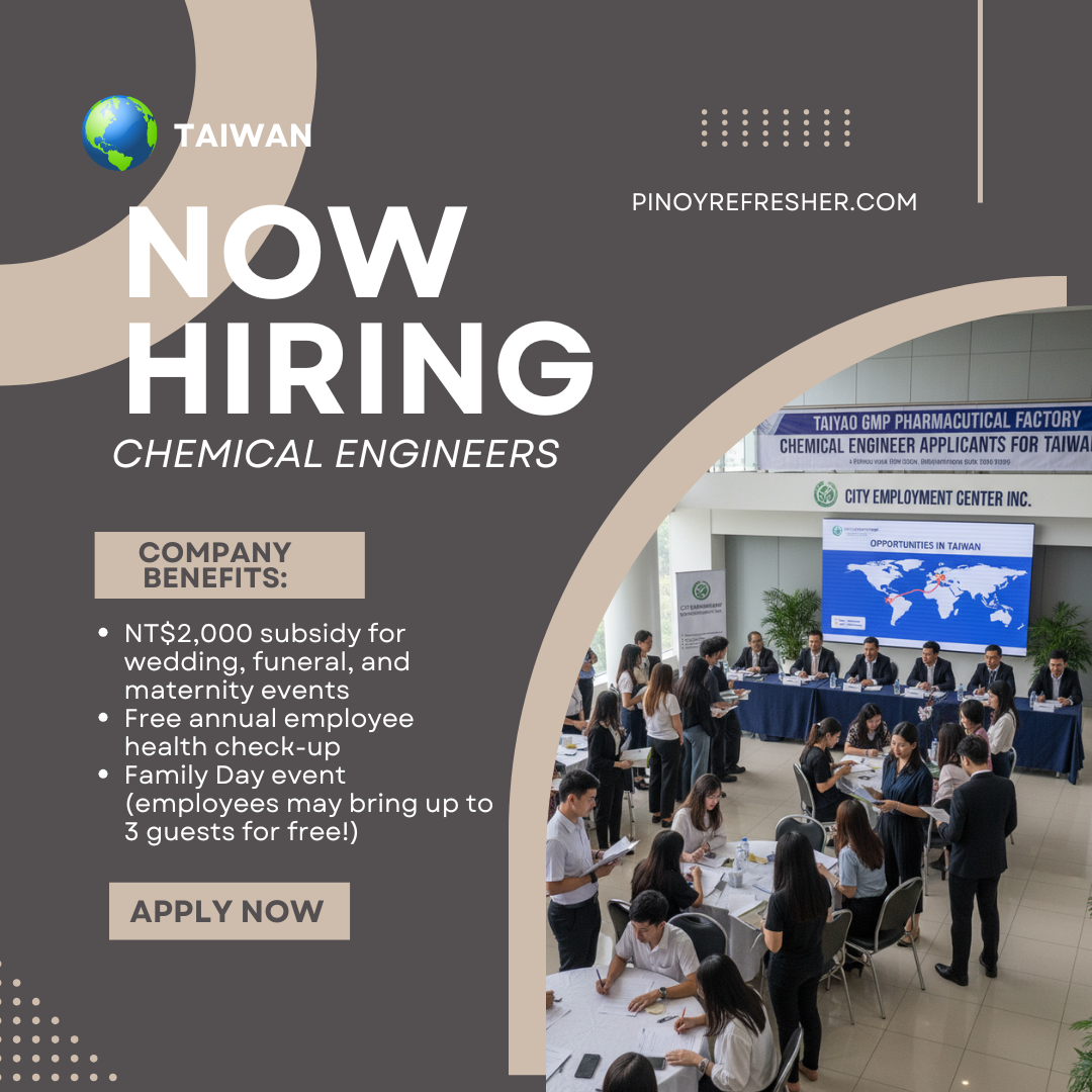 TAIWAN — City Employment Center Inc. is calling on qualified Filipino professionals to apply for Chemical Engineer positions at Taiyao GMP Pharmaceutical Factory, one of Taiwan’s leading producers of Active Pharmaceutical Ingredients (API).
