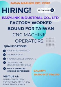 Manila, Philippines β Skilled Filipino workers now have a new opportunity to work abroad as Easylink Industrial Co., Ltd. opens hiring for Factory Workers specializing in CNC machine operations bound for Taiwan. πΉπΌβ¨