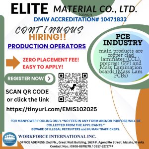 Elite Material Co., Ltd. (EMC) — one of Taiwan’s top manufacturers in the Printed Circuit Board (PCB) industry — is now continuously hiring Production Operators for deployment to Taiwan!