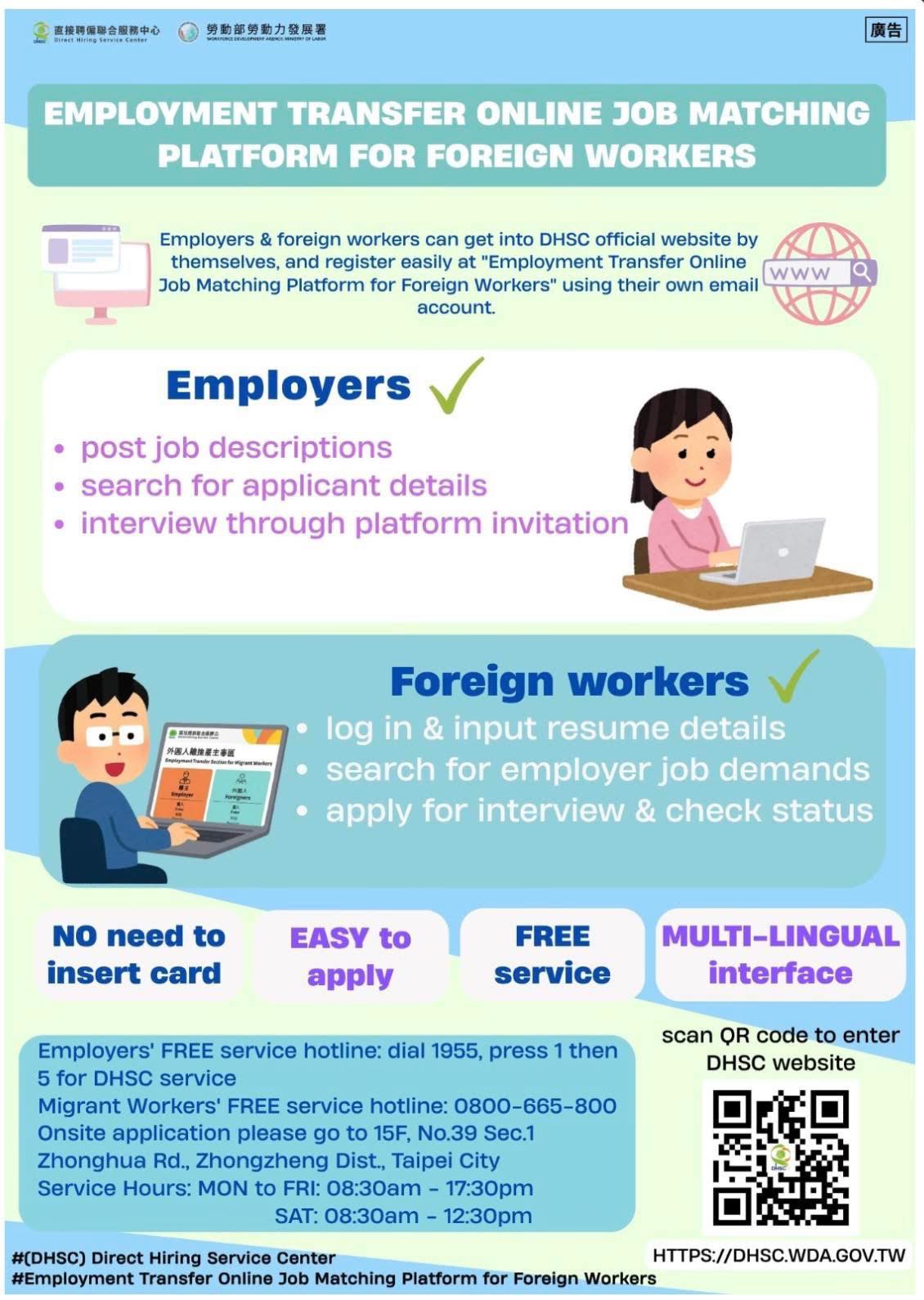 The Direct Hiring Service Center (DHSC) under Taiwan’s Workforce Development Agency (WDA) introduces the Employment Transfer Online Job Matching Platform for Foreign Workers — an easy, free, and secure way for both employers and migrant workers to connect and manage employment transfers online.