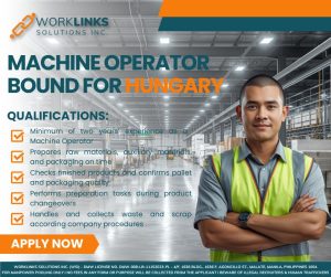 Filipino skilled workers looking to advance their careers abroad now have a promising opportunity. WorkLinks Solutions Inc. is currently hiring experienced Machine Operators to work in Hungary. This role offers competitive pay, international work exposure, and professional growth in a dynamic manufacturing environment.