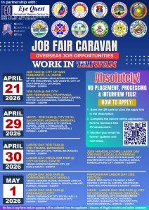 MANILA, Philippines β Filipino job seekers looking to work abroad can take advantage of a major recruitment initiative as EyeQuest Intl. Manpower Services Inc. rolls out its Labor Day Job Fair Caravan, offering overseas employment opportunities in Taiwan πΉπΌ.