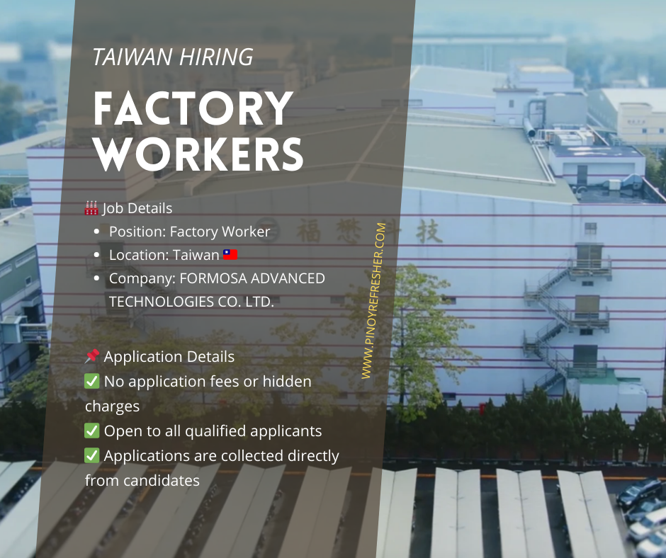 🇹🇼 Exciting Opportunity: Factory Workers Needed in Taiwan (No Placement Fee!)