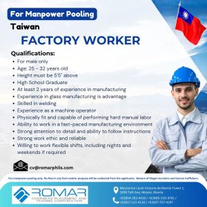 A new overseas employment opportunity has opened as Romar Overseas Placement and Trading Corporation announces manpower pooling for Factory Workers bound for Taiwan. The hiring is for a prospective employer in Taiwanโs manufacturing sector, offering qualified Filipino workers a chance to work abroad in a fast-paced industrial environment.