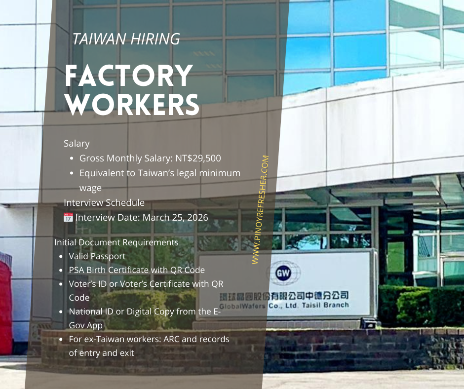 This opportunity offers competitive compensation aligned with Taiwan’s legal minimum wage and provides a chance for Filipinos to gain international work experience in the semiconductor manufacturing industry.