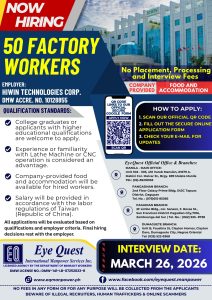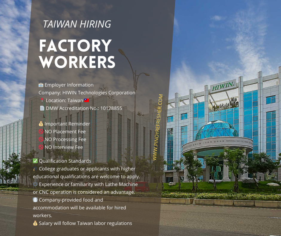 Great opportunity for Filipino workers who want to build a career in Taiwan’s advanced manufacturing industry. If you have a technical background, CNC knowledge, or factory experience, this job could be your gateway to working abroad! 🌏✈️