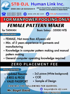 STB-DJL Human Link Inc., a POEA-licensed recruitment agency, is now hiring Female Pattern Makers bound for Taiwan! This is your chance to join a reputable company abroad and earn a competitive salary while enhancing your skills in the fashion and garment manufacturing industry.