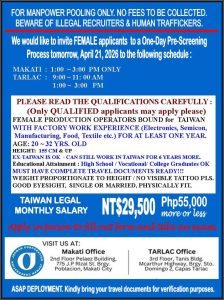 A licensed recruitment agency is set to conduct a one-day pre-screening activity for qualified female applicants seeking employment opportunities in Taiwan. The hiring initiative is strictly for manpower pooling and emphasizes a no-fee recruitment policy, warning applicants to remain vigilant against illegal recruiters and human trafficking schemes.