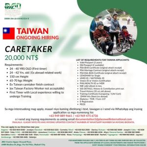 MakatiA licensed recruitment agency based in Makati has announced an ongoing hiring program for female caregivers bound for Taiwan, offering a monthly salary of NT$20,000 as demand for foreign care workers continues to grow.