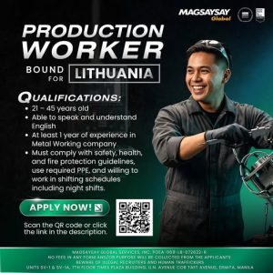 A new overseas employment opportunity is now open for Filipino workers as MAGSAYSAY Global announces the hiring of Production Workers bound for Lithuania, offering qualified applicants a chance to work in Europeβs growing industrial sector.