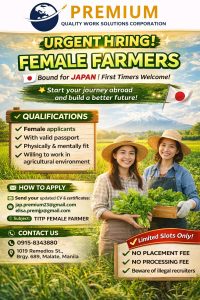 The office handling the recruitment is located at 1019 Remedios St., Brgy 689, Malate, Manila. Applicants are encouraged to apply promptly to take the first step toward their career opportunity in Japan’s agricultural sector.