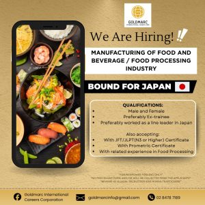 Take your career overseas and grow with a trusted company in Japan! Goldmarc International Career Corporation is looking for qualified candidates to join the Food & Beverage / Food Processing Industry.
