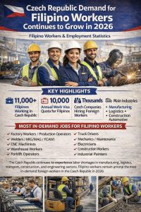 Manila, Philippines – Prime Search Manpower Agency Inc. reports a rising demand for Filipino workers in the Czech Republic across multiple industries in 2026. Employment opportunities continue to grow, with over 11,000 Filipinos already contributing to key sectors such as manufacturing, logistics, construction, and automotive.