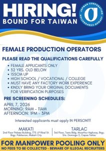 Filipino women seeking stable overseas employment now have a new opportunity as recruitment opens for Female Production Operators. Interested applicants are invited to participate in a 1-Day Pre-Screening Activity to qualify for employer interviews.