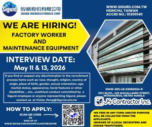 Looking for a stable and rewarding job abroad? π Great news! Sigurd Microelectronics Corp. is now urgently hiring Factory Workers and Maintenance Equipment Technicians to join their growing team in Taiwan! πΌβ¨