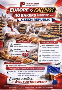 Your opportunity has arrived! Prime Search Manpower Agency Inc. is now hiring 40 Bakers for exciting job opportunities in the Czech Republic.