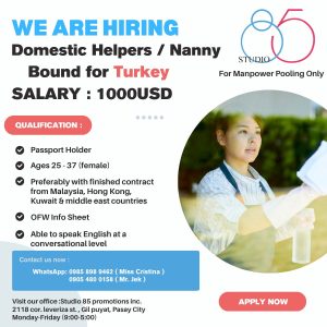 Studio 85 Promotions Inc. is looking for qualified and hardworking Domestic Helpers / Nannies who are ready to work abroad and build a rewarding career in Turkey.
