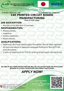 Are you looking for a stable and rewarding job abroad? Two reputable recruitment agencies, EMS Services International, Inc. and Ibiden Career Techno Corp., are now hiring Filipino workers for manufacturing positions in Japan. This is your opportunity to gain international experience, develop your skills, and build a successful career overseas. 🌏✨